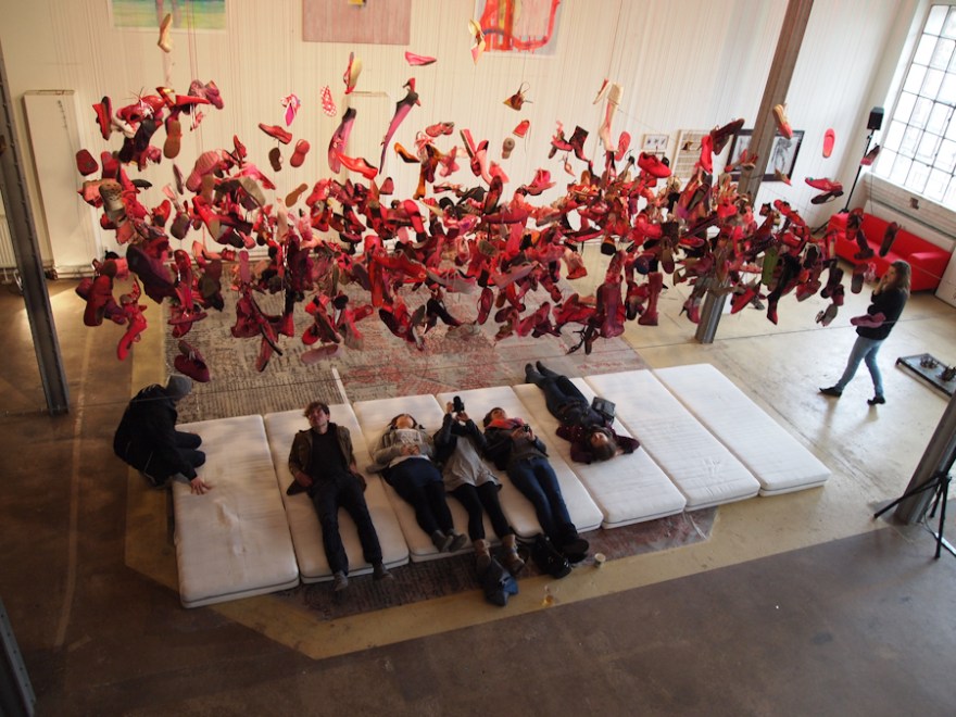 We can never know what the future will bring. This is true of all things including our health. We can only be proactive and do our best to be our best. Sometimes there are things that are out of our control. This installation is one in a series using donated shoes for Pink Shoe Day. 70,000 women in Germany are diagnosed with breast cancer each year. This is the only cancer that is on the rise. Oncologist Luisa Mantovani Löffler wanted to do something to reverse this by raising awareness. Pink is the signature color for breast cancer in many countries. She wanted to do something to help people conceptualize exactly how many 70,000 is. She also knew that fear is the biggest problem in Germany so she thought of shoes. Everyone has an old pair of shoes lying around. Her idea was to have people paint them pink and send them in with a donation for Hausleben. Hausleben is a center that cares for the whole person and their families. They have many programs to help deal with things traditional medicine can’t. This is working! Women are getting together and painting shoes and talking about breast cancer. It is in their minds and they can start finding out what they can do now to decrease their chances of being part of the 70,000. When I work with the shoes I can feel that they each have stories on lots of levels. These are the shoes of women and those who love them. It is a great honor to do this work. This particular installation includes more than 800 shoes hanging from the ceiling with 7 mattresses beneath them. The mattresses are two-fold. They represent Hausleben and the fact that if you do fall, they are there to make the landing softer. They also invite you to lie under the installation and look at things in a new way; a way without fear. This installation is the central piece 70.000+ /ignore it and it won’t go away. I invited 7 women who had been touched by cancer to participate. I wanted to be sure they understood the importance of what we were doing.